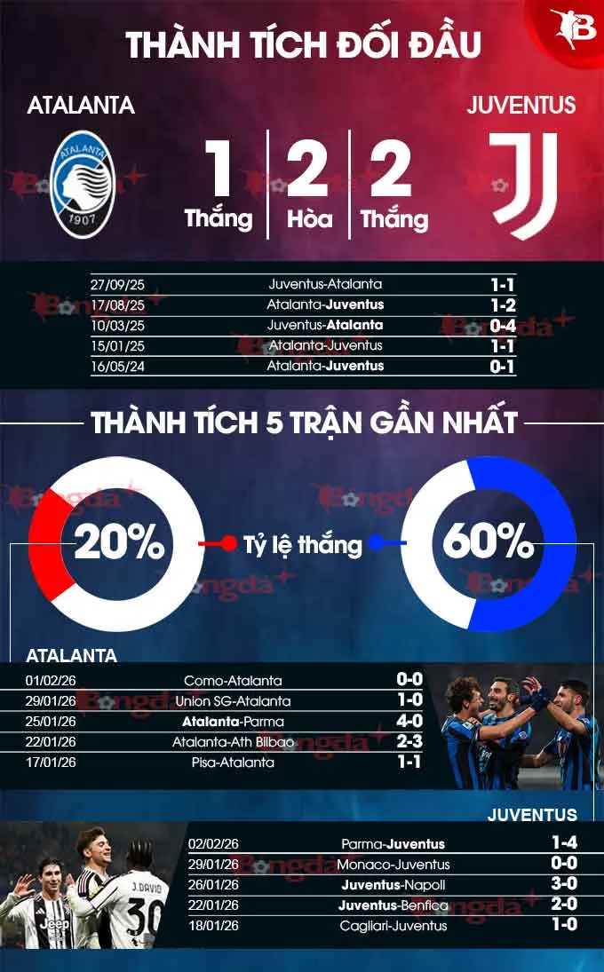 Xét về thành tích đối đầu, Juventus hoàn toàn áp đảo Atalanta trong thập kỷ gần đây. Trong 10 lần chạm trán gần nhất, Juventus thắng 3, hòa 6 và chỉ thua 1. Đặc biệt, trên sân của Atalanta, Juventus đã bất bại 6 trận liên tiếp, thắng 3. Điều này cho thấy lợi thế tâm lý rõ rệt thuộc về đội khách.