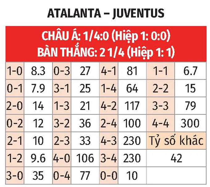 Cả hai cùng ghi bàn: Atalanta đã tìm thấy lưới đối phương trong 6/10 trận gần nhất, trong khi con số này của Juventus là 8/10. Trên sân nhà, Atalanta ghi bàn ở 8/9 trận, còn Juventus làm được điều tương tự ở 8/10 trận làm khách. Điều này hứa hẹn một trận cầu có nhiều bàn thắng được chia đều.